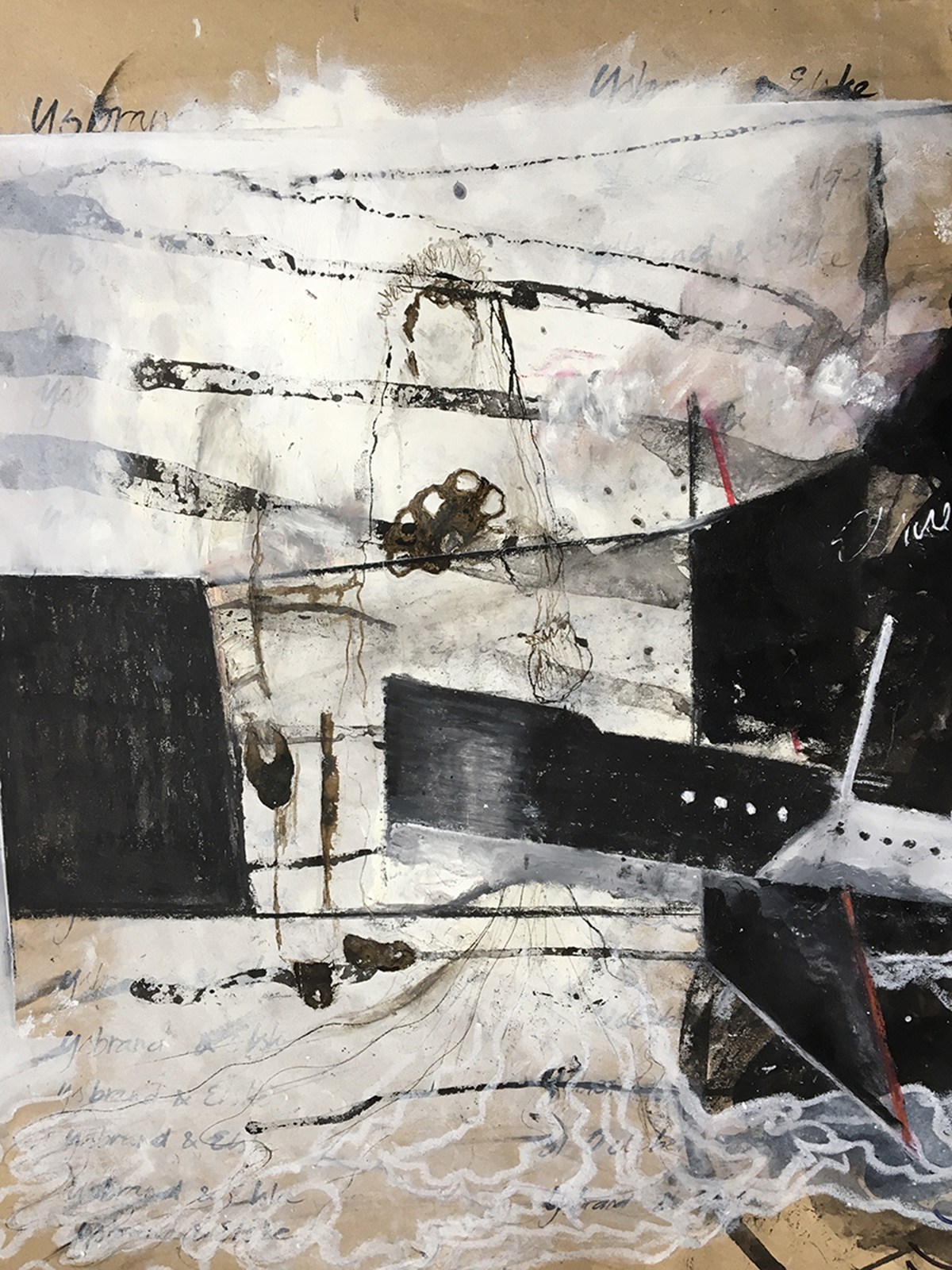 Ik werk graag met inkt en water op verschillende soorten papier, aangevuld of overtekend met oliepastel. Het onvoorspelbare van water waaraan inkt wordt toegevoegd geeft me een vrijheid die ik niet krijg door louter tekenen.